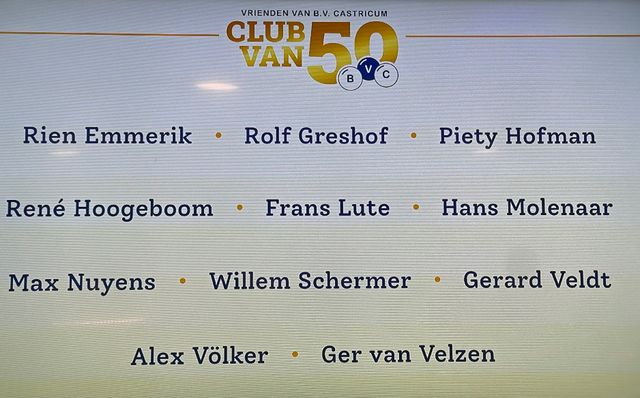 Rolf werd ook gevraagd om het nieuwe initiatief "De Club van 50" te onthullen. Enigszins aarzelend liep hij naar het grote televisiescherm met de gedachte van wat hing hem nu weer boven het hoofd. Tot zijn opluchting was het inderdaad de startpagina van de "Club van 50", waarmee vrienden van de BVC voor € 50,- per jaar kunnen bijdragen aan de groei en promotie van de biljartsport, met speciale aandacht voor jongeren.